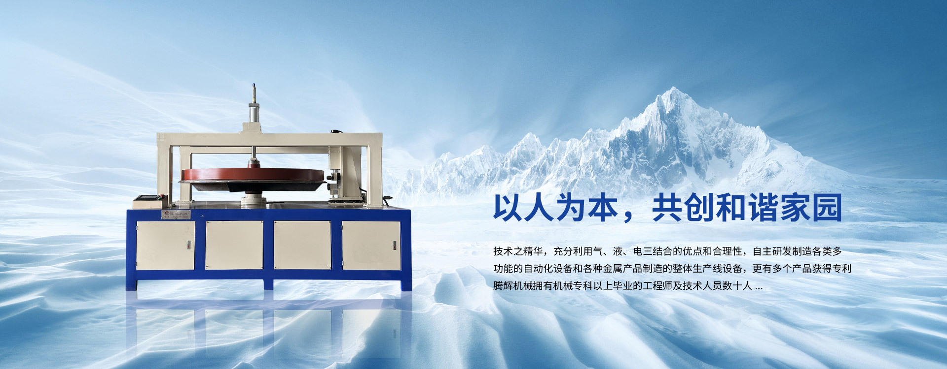 技術之精華,充分利用氣、液、電三結合的優點和合理性,自主研發制造各類多功能的自動化設備和各種金屬產品制造的整體生產線設備,更有多個產品獲得專利。騰輝機械擁有機械專科以上畢業的工程師及技術人員數十人,各種職能部門配置齊全,擁有專業的設計,精湛的制造技術,具備一流的設備配套,還有完善的工藝流程...